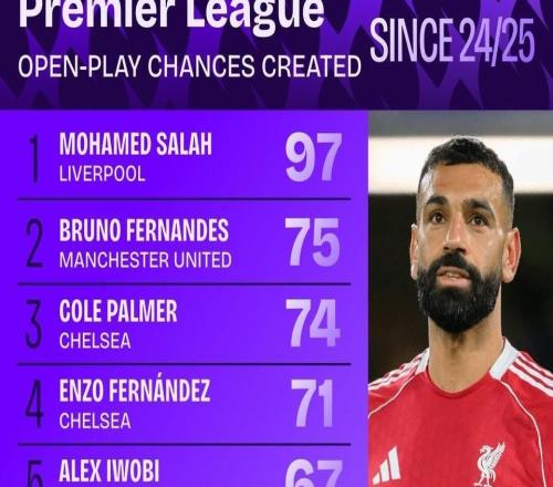 自上赛季以来英超运动战创造机会榜:萨拉赫居首,B费第二
