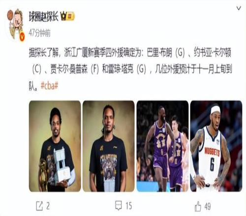 据媒体人“赵探长”报道,浙江广厦俱乐部四名外援全部确定下来了,广厦已经与他们达成了签约,这四名外援分别是巴里-布朗、约书亚-卡尔顿、贾卡尔-桑普森、雷琼-塔克,预计11月中旬可以与广厦会合。