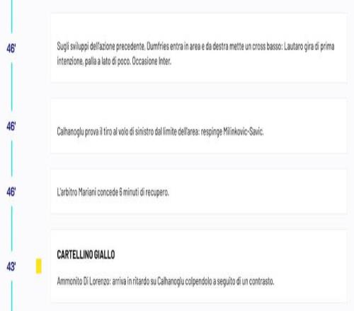 比赛的转播画面和意甲官网的文字直播原本都显示吉尔摩在第43分钟飞铲恰尔汗奥卢犯规吃到黄牌,随后第46分钟这位苏格兰球星又拉倒邓弗里斯破坏国米反击再次染黄,正当人们困惑为什么当值主裁马里亚尼没有向吉尔摩出示红牌的时候,意甲官方随后对他们的文字直播内容进行了更正,他们将第一张黄牌的得牌球员更改为了迪洛伦佐。