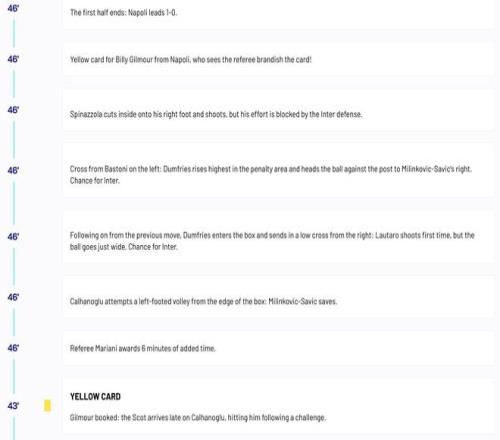 北京时间10月26日,在意甲第8轮的焦点战中,那不勒斯依靠一粒争议点球在半场过后主场1-0领先于国际米兰,除了点球判罚以外,意甲官网的文字直播也给前45分钟的比赛进一步增加了话题性。