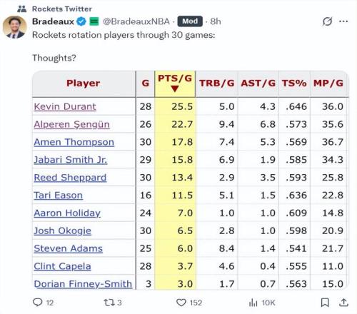 火箭记者Bradeaux总结了球队前30场比赛,战绩20胜10负西部第四,杜兰特25.5分第一,申京22.7第二,阿门17.8分第三,小贾15.8分第四,谢泼德13.4分第五,伊森11.5分第五,火箭五人上双。