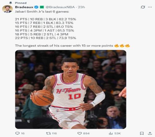 他还表示谢泼德自11月以来,他是非先发BPM最高(4.6)的球员,场均拿到14分2.8篮板3.5助攻1.7抢断,真实命中率61%,三分命中率43%,正负值+8.7,谢泼德是最佳第六人的有力争夺者。