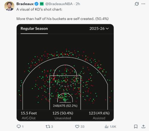 杜兰特更强悍,37岁的他命中率52.2%,三分命中率43.7%,而且他的出手占比有50.4%是自主创造的进攻机会,这样的KD依旧还在巅峰。