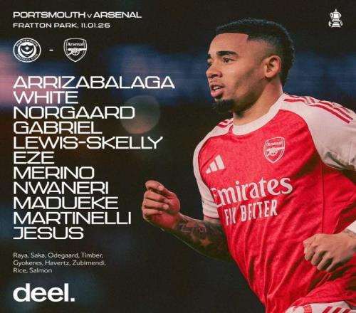 阿森纳客战朴茨茅斯:埃泽、热苏斯首发,马杜埃凯出战