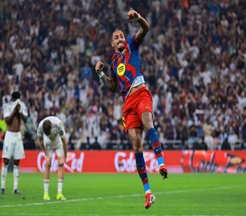 本场比赛弗利克派出三叉戟首发上阵,亚马尔、拉菲尼亚和莱万多夫斯基三剑合璧。尽管开场阶段受到皇马五后卫铁桶阵和主动对抗的影响,巴萨进入状态比较慢,但正是从拉菲尼亚错失破门机会开始,巴萨的攻势高潮迭起。刚刚错失良机的拉菲尼亚很快便再度接到妙传并破门得分,帮助巴萨打破僵局,也引发了后续的剧情。下半场比赛再度陷入胶着之际,又是拉菲尼亚将僵持局面打破,他的射门在打中阿森西奥后折射入网,巴萨凭借此球捧起超级杯冠军奖杯,独中两元的拉菲尼亚当仁不让地捧走全场最佳奖杯。