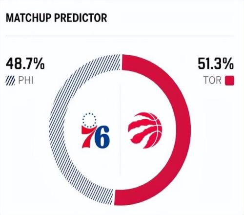 赛前,美媒ESPN对本场比赛进行了胜率预测,猛龙队队胜率为51.3%,略占优势,76人的胜率则仅有48.7%。