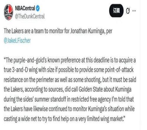 名记Fischer近日报道称,湖人一直在密切关注着库明加,且早在去年夏天便致电勇士询问过相关情况。