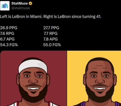 根据美国媒体StatMuse数据,在热火时期,詹姆斯场均26.9分7.6篮板和6.7次助攻,而41岁以后的詹姆斯场均27.7分7.7篮板和7.8次助攻,命中率也热火时54.3%提升到55%。