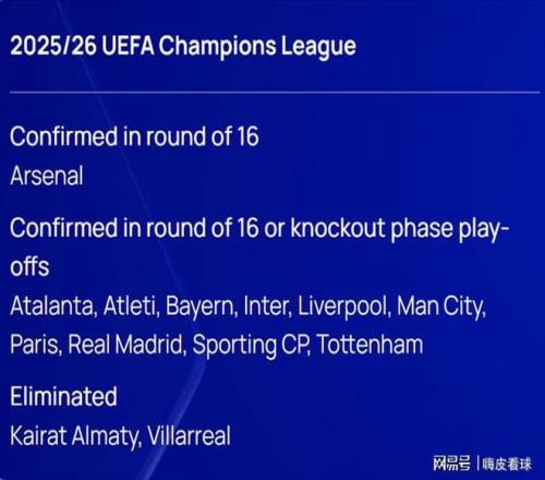 另外,英超的热刺、曼城和利物浦,西甲的皇家马德里和马德里竞技,意甲的亚特兰大和国际米兰,德甲的拜仁慕尼黑,法甲的巴黎圣日耳曼,葡超的葡萄牙体育,这10支球队,已经获得出线权,至少确保可以参加16强附加赛。